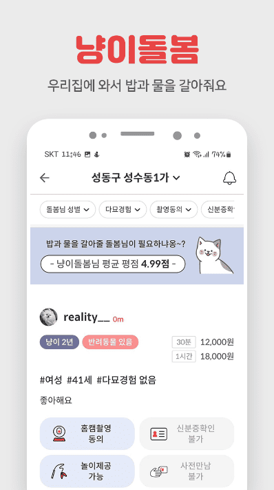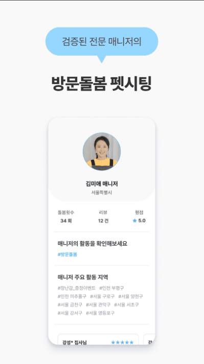- 집근처에서 돌봄을 구할수 있는데다가 산책이나 장소까지 결정할수 있고 홈캠이나 신분확인도 돼서 맡길때 너무 좋아요 안전하게 가까운 곳에 맡길수 있다는게 너무 좋네요 게다가 대부분 반려동물이 있으셔서 이해도가 높아요 동네에서 친구를 만들어줄수도 있어서 완전 강추입디다! 돌봄이나 친구뿐만 아니라 여러가지 정보까지 알수있어서 한곳에서 다 해결이 가능해서 편리하네요