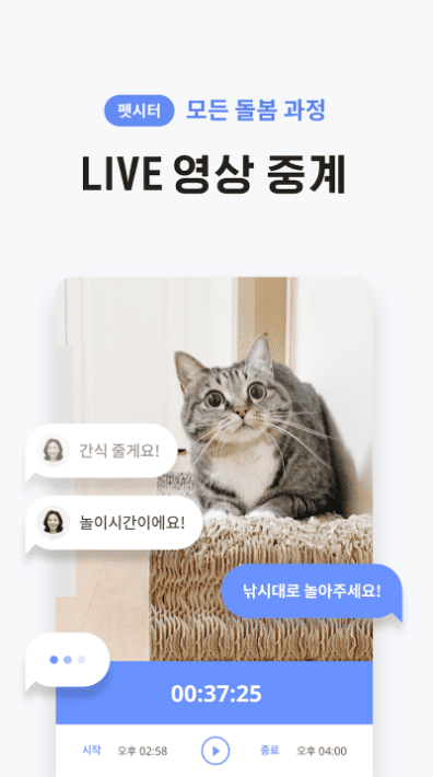 - 실시간 1:1 대화 : 실시간 영상을 보며, 펫시터와 채팅을 주고 받아보세요.