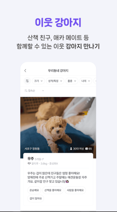 강아지의 사회성을 길러주기 위해 자주 만날 산책친구를 찾고 있으신가요?