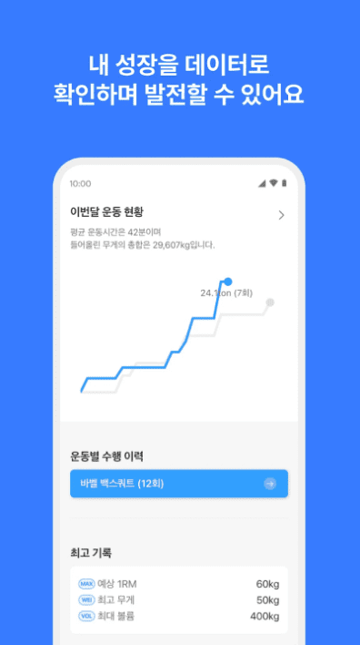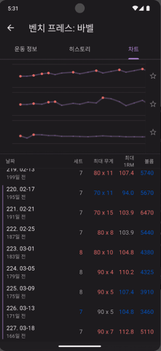 - 운동량, 1RM 계산, 최대 중량, 렙/세트 횟수 등 하드웨어 가속 차트