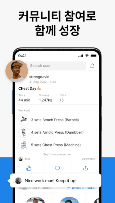 - 다른 어플들 보다 UI가 깔끔해서 사용하기 좋은 것 같고 커뮤니티 기능이 있어, 운동에 관해 사람들과 소통도 가능하고, 운동 끝나고 다른 사람들과 서로 얼마나 운동했는지 비교도 할 수 있어서 굉장히 유용한 앱입니다!
