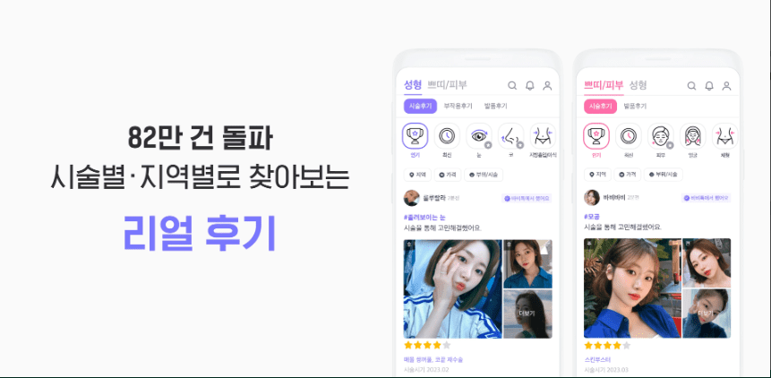 100만 개 후기와 실시간 유저,전문의 답변까지 볼 수 있는 피부 시술&성형어플! 피부관리,성형,뷰티 정보를 성형어플 하나로 모아 볼 수 있어요!