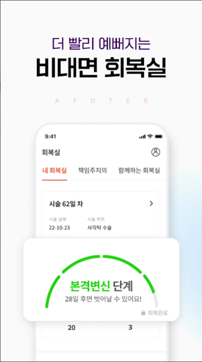 - 성형하고 불안햇던것들이 많았는데 막상 붓기나 얼마나잘된건지에 대한 성형에프터에대한 앱들이 없더라구요ㅠㅠㅠ근데 이앱은 경과표시등이랑 이것저것 다른분들 경과도 볼수있어서 불안함이 훨씬줄어들어서 좋았어요!! ♡♡ 개발자님 피드백도빠르시고!!불편사항 그때그때 반영해주시고 ㅜㅜ 감동입니다!!