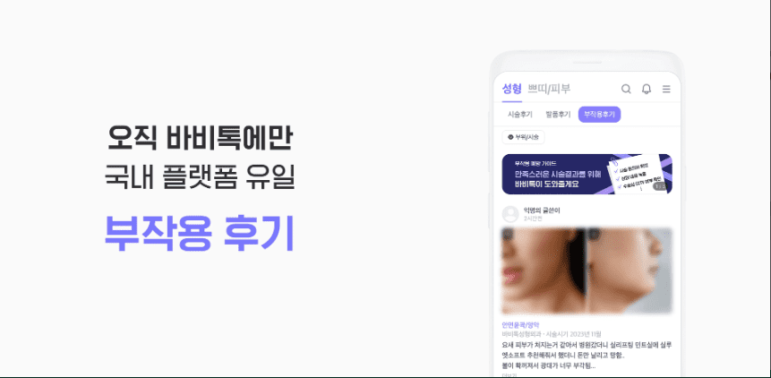 성형어플 중 바비톡이 국내 유일! 성형 수술 또는 피부 시술 전, 여러분의 객관적인 선택을 도울 수 있도록 ‘성형 및 피부 관리 시술 부작용 후기’ 서비스가 출시되었습니다.