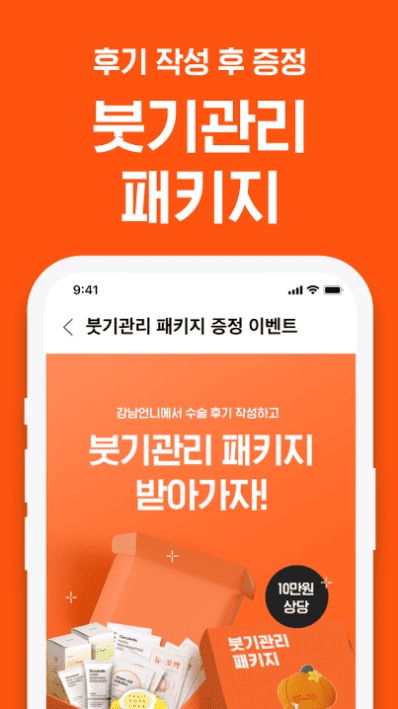 피부 시술&성형어플 강남언니에서 수술 완료시 10만 원 상당의 붓기관리 패키지 증정! 성형 및 피부 시술 정보도 얻고 전문 피부과,성형외과 상담도 하고, 고급 패키지까지 받아 보세요!