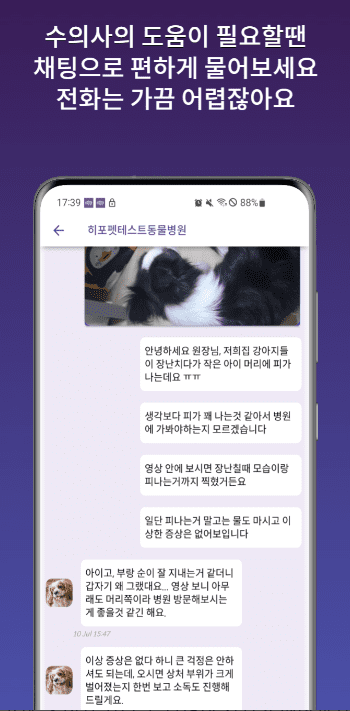 히포펫은 실시간으로 수의사와 상담할 수 있는 기능을 제공합니다. 건강에 관한 질문이나 우려 사항을 수의사에게 전달하고, 전문적인 조언과 도움을 받을 수 있습니다. 응급 상황이나 비상시에도 신속한 도움을 제공하여 반려동물의 안전과 건강을 지킬 수 있습니다.