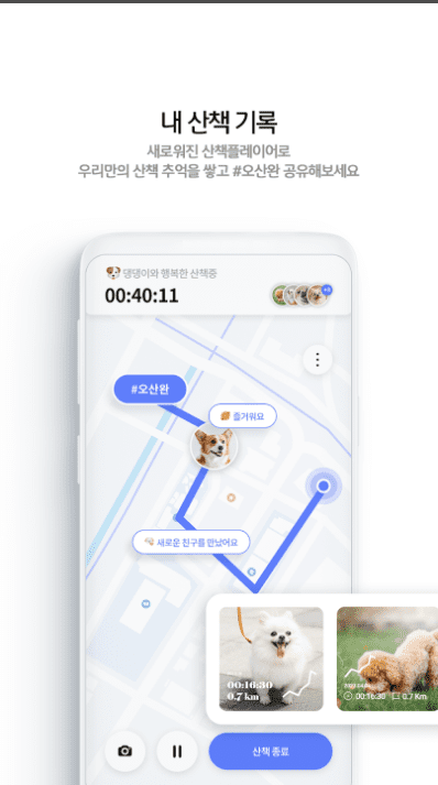 - 반려동물의 건강을 위해 편리한 산책 트래킹 기능과 포토메모 기능을 제공하여 더 좋은 산책 경험을 만들어 주고자 합니다.