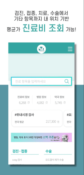 - 검진, 접종, 치료, 수술에서 기타 항목까지 내 위치 기반 평균가, 최저가, 최고가 조회 와 지역별 선택 조회 가능