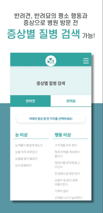 - 반려견, 반려묘의 평소 행동과 증상으로 병원 방문 전 질병 검색 가능