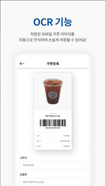 인공지능 AI 기반 기프티콘 자동인식 기능으로 이름, 사용처, 만료기한을 자동인식 합니다.