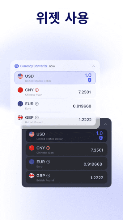 통화 변환기 위젯. 실시간 환율에 즉각적으로 액세스합니다.