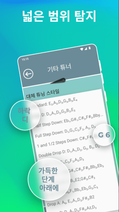 - 맞춤 튜닝 – 기타, 바이올린 등을 위한 사운드(음표) 선택