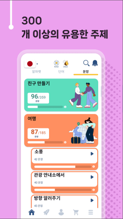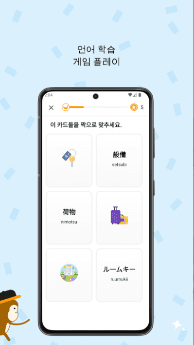 다양한 미니 게임과 도전으로 일본어를 배우면 새로운 언어를 배우는 것이 재미있고 전혀 공부하는 것처럼 느껴지지 않을 것입니다!