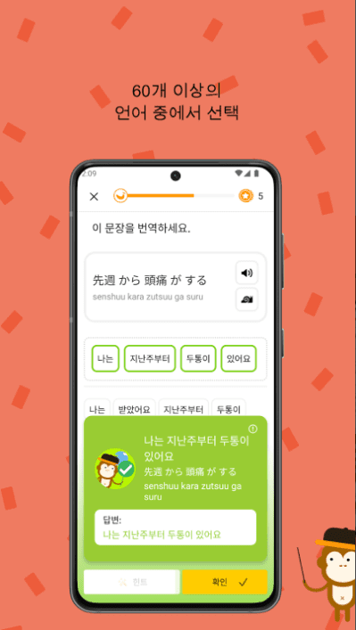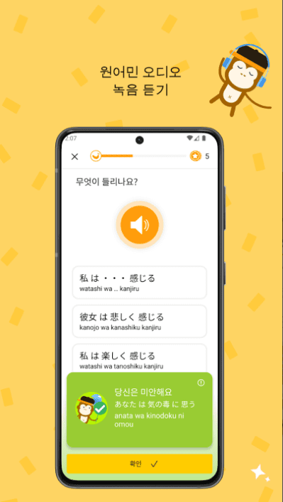 🏎 5분 동안 진행되는 세션: 이렇게 짧은 연습시간은 이상하게 들리죠. 하지만 이 짧은 시간이야말로 정말 중독적인 학습으로 만들어드리는 시간입니다. 외국어를 배울 때 단 5분밖에 필요하지 않다는 걸 상상할 수 있으세요?! 너무 바쁠 때에도 변명할 여지가 없죠!