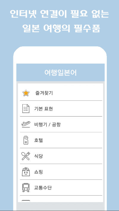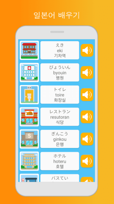 일본어 학습용 앱을 사용하여 대화, 숫자, 취미, 숙박 시설, 형용사, 동물, 색상, 옷, 국가, 길 찾기, 응급 상황, 음식, 언어 문제, 질문, 구문, 문장 및 기타 단어를 포함한 숙어집 세트를 배울 수 있습니다. 해당 일본어 코스에서는 유용한 카테고리별로 분류된 수 많은 공통 단어 및 구문을 학습할 수 있습니다.