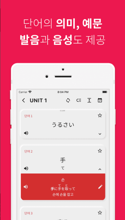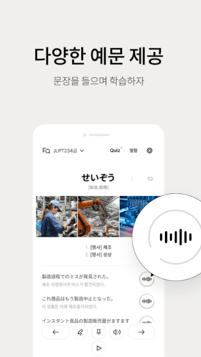 - 명확한 발음의 일본어 원어민의 고품질 오디오를 제공합니다