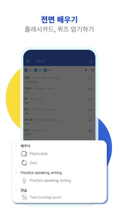 오디오 속도를 조정하고 읽기 음성을 변경합니다. JLPT 시험을 위한 듣기 및 발음 능력을 향상시키기 위해 듣고 반복하십시오. 비디오와 팟캐스트를 통해 듣기와 일본 문화 학습을 연습합니다. 두 배의 재미를 위해 일본 노래를 통해 음악과 함께 일본어를 배우십시오.