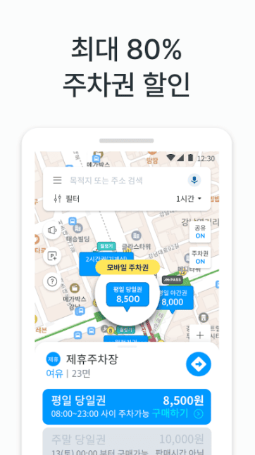 주차장 관리소 방문 없이 앱으로 주차권(시간권, 당일권, 월정기권)을 할인된 가격으로 간편하게 구매해 보세요.