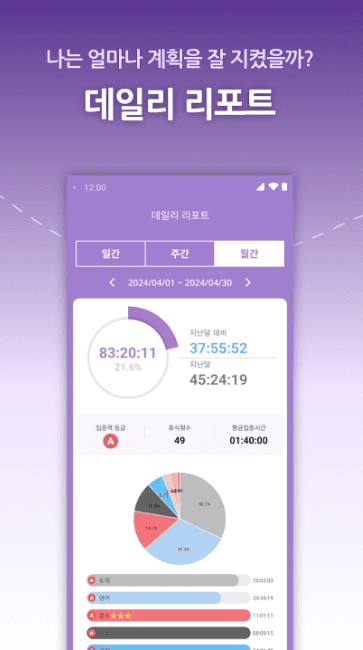 - 처음에 깔고나서는 얼마나 꾸준히 할까 싶었는데 하다보니 A등급 받는것과, 시간이 한눈에 보이니까 뿌듯해져서 즐기면서 하게 되네요!:) 그리고 목표설정에 제한이 있어 과금 생각하고 있었는데 이벤트로 7일 달성하면 5,500포인트나 줘서 덕분에 3개월이나 체험할 수 있게 됐어요ㅠㅠ 감사합니다!! 그리고 광고보고 포인트 얻는것도 광고가 막 이상한광고들이 있는 게 아니라서 여러모로 너무 만족하고 있습니다!