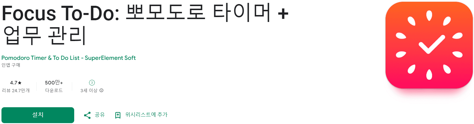 - 전반적으로 이만하면 만족합니다. 제대로 만든 포모도로 어플이네요. 시각적으로 카운트다운 되면서 집중용 화이트노이즈가 제공되고, 할일 목록 관리도 간편합니다. 영구구매를 바로 했습니다. 아이패드에서도 추가금 없이 사용 가능해요.