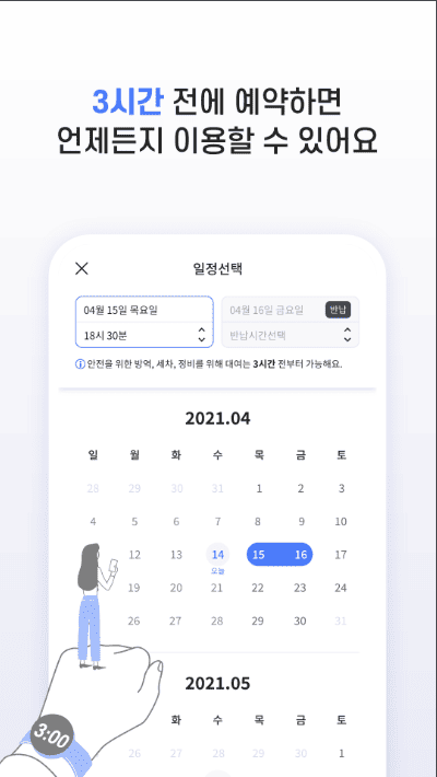 · 최소 30분부터 10분 단위로 원하는 만큼 예약 가능