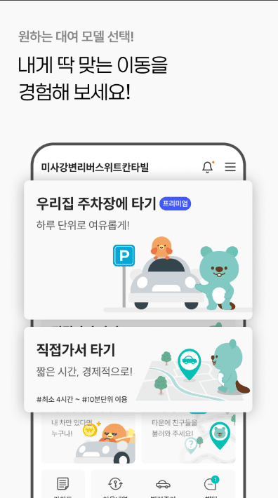 자동차가 필요한 날 → 이웃의 자동차를 편하게 대여 할 수 있고, 나의 자동차가 쉬는 날 → 이웃에게 대여 해주고 소정의 수익을 얻을 수 있답니다.