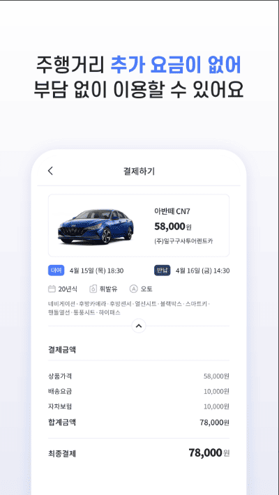 까다로운 신용심사, 선수금, 보증금, 약정 기간, 위약금 없이 원하는 렌터카 이용이 가능해요.