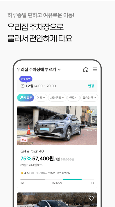 하루 종일 세금, 보험료만 낭비하며 주차된 내 차... 내가 사용하지 않을 때 이웃에게 대여해주고 수익을 만들어 보세요! 수익금은 매월 정산할 수 있습니다^^