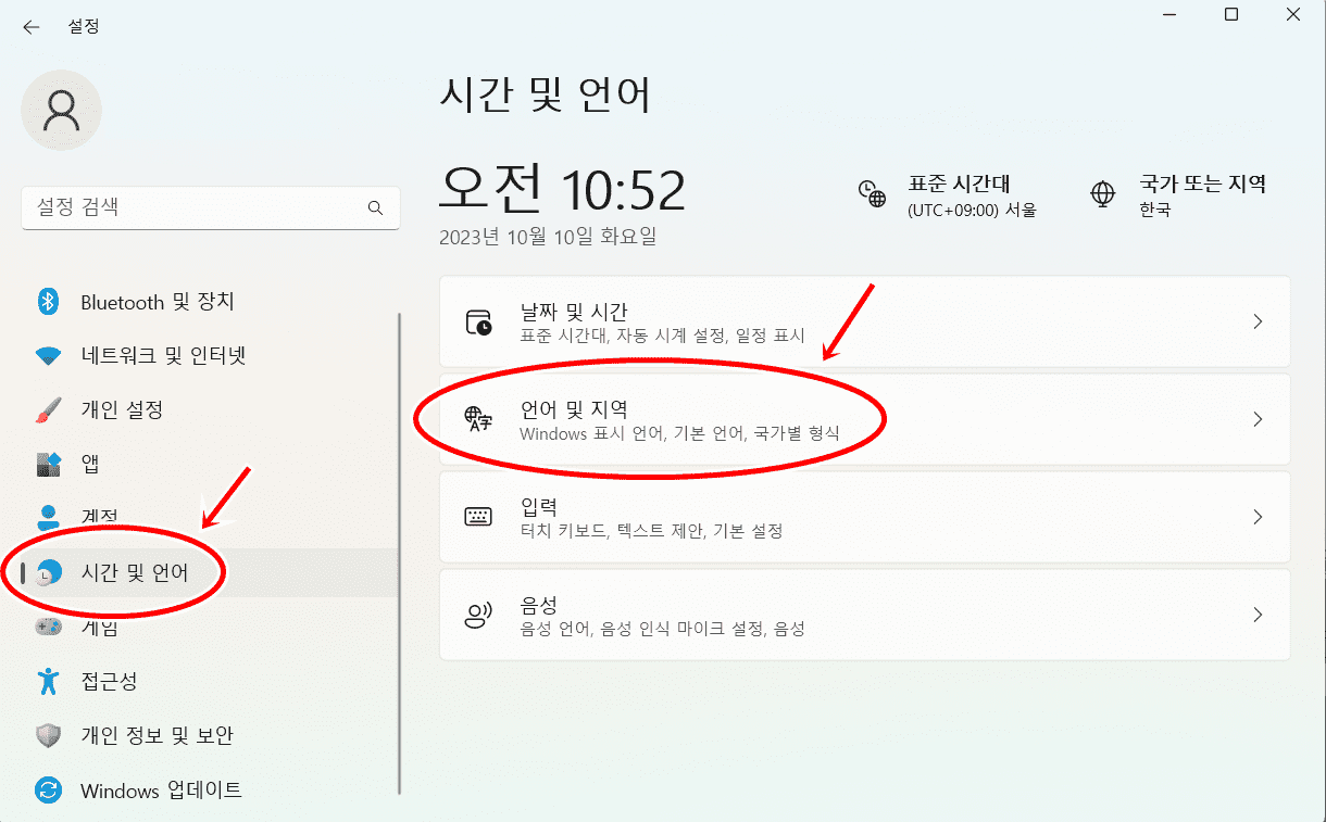 3. 왼쪽 목록에서 [시간 및 언어]를 클릭합니다.