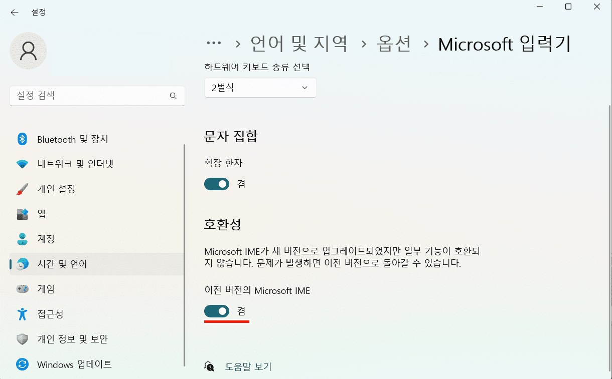 ▶ 이전 버전의 Microsoft IME가 끔에서 켬으로 설정되었습니다. 그 결과 타자 밀림 현상이 사라진 것을 확인할 수 있습니다.