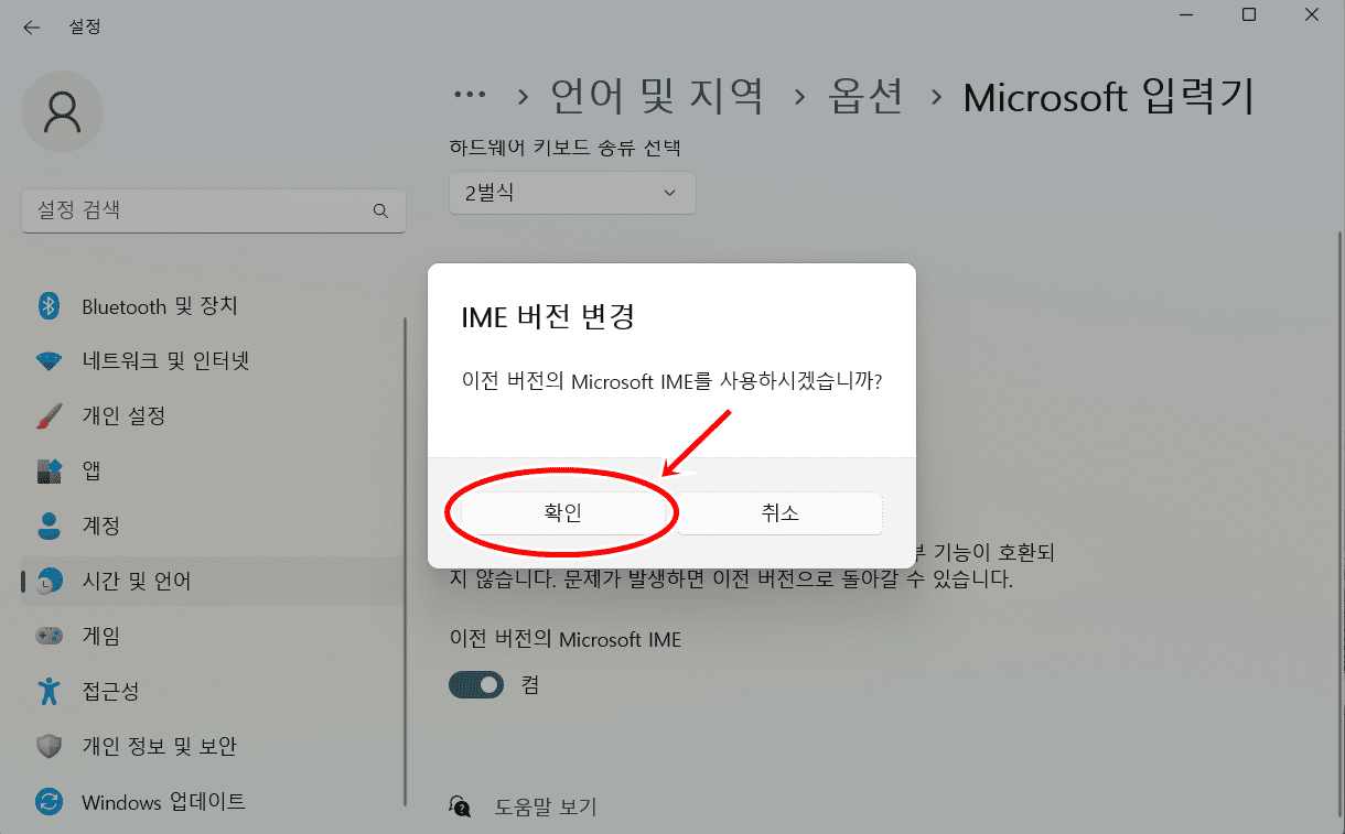 10. 이전 버전의 Microsoft IME를 사용하시겠냐는 안내가 뜨면 [확인] 버튼을 클릭합니다.