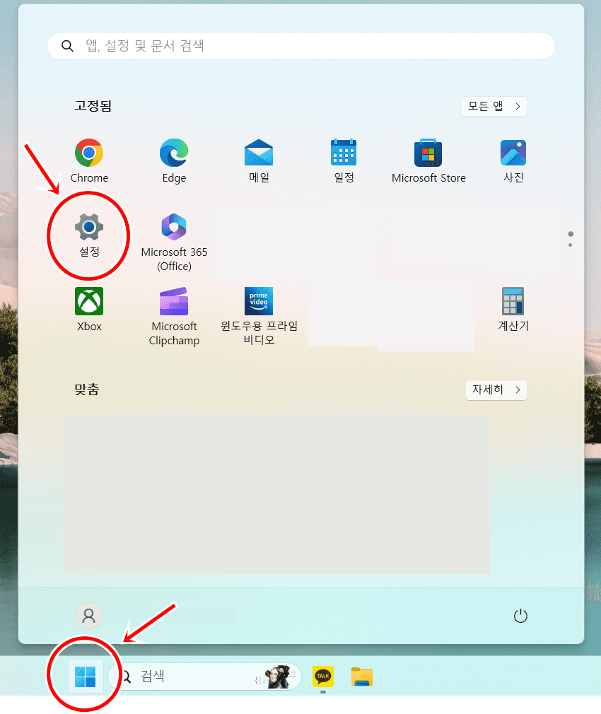 1. 작업표시줄에서 [윈도우 시작] 버튼을 클릭합니다.