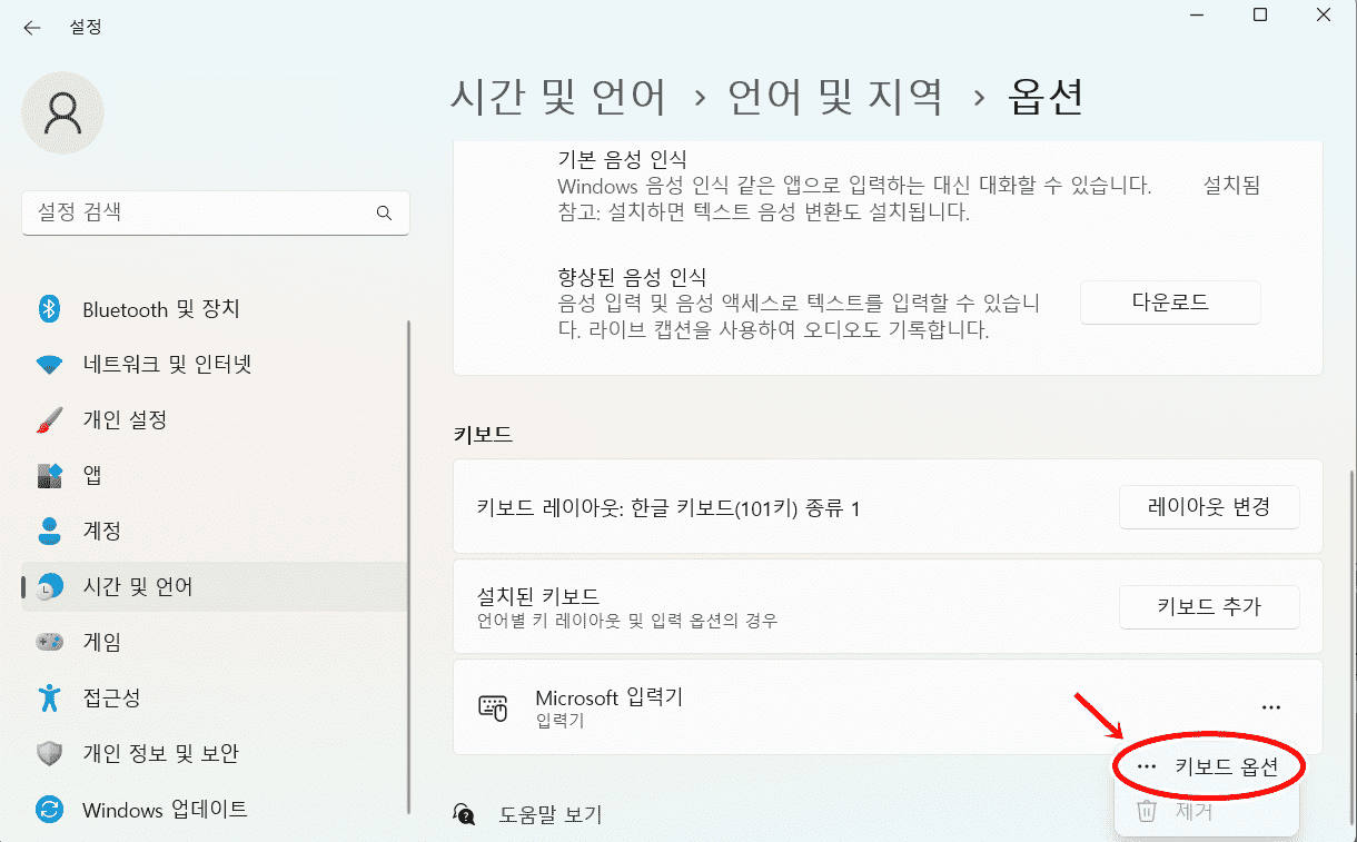 7. 키보드 항목에 있는 [Microsoft 입력기 > 더 보기] 버튼을 클릭합니다.