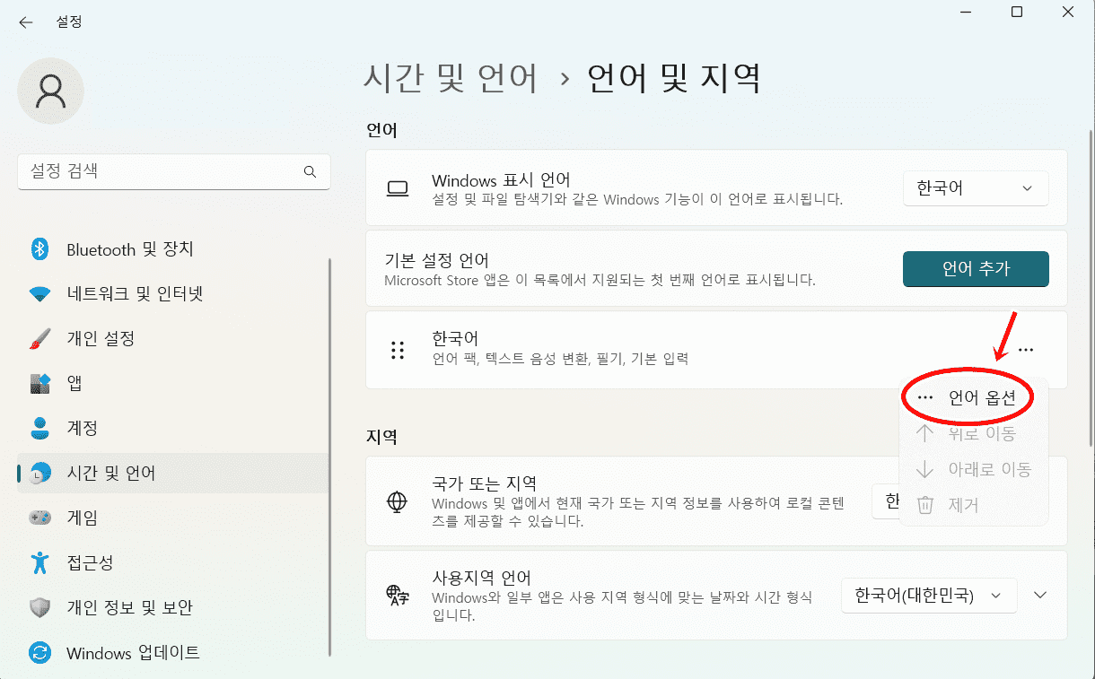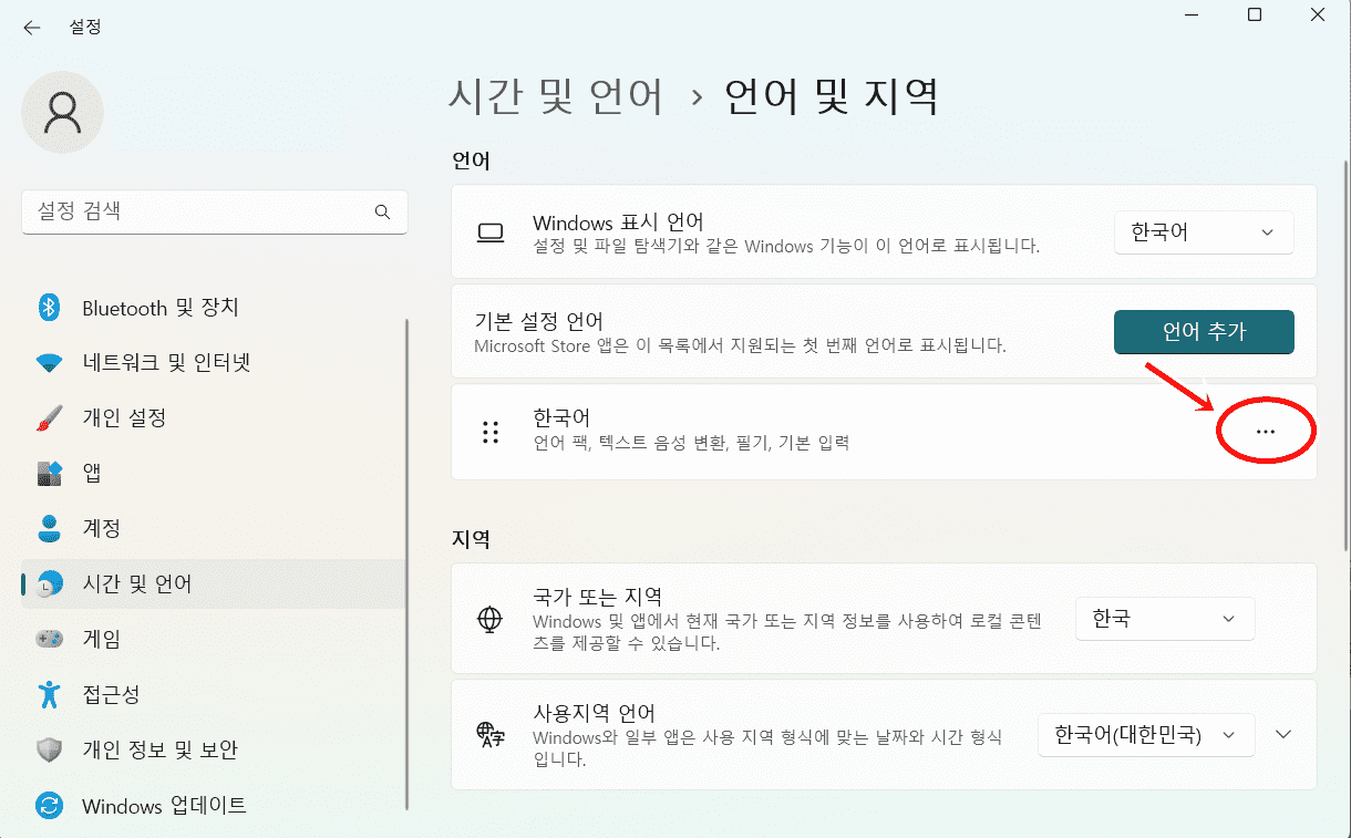 5. 언어 항목에 있는 [한국어 > 더 보기] 버튼을 클릭합니다.