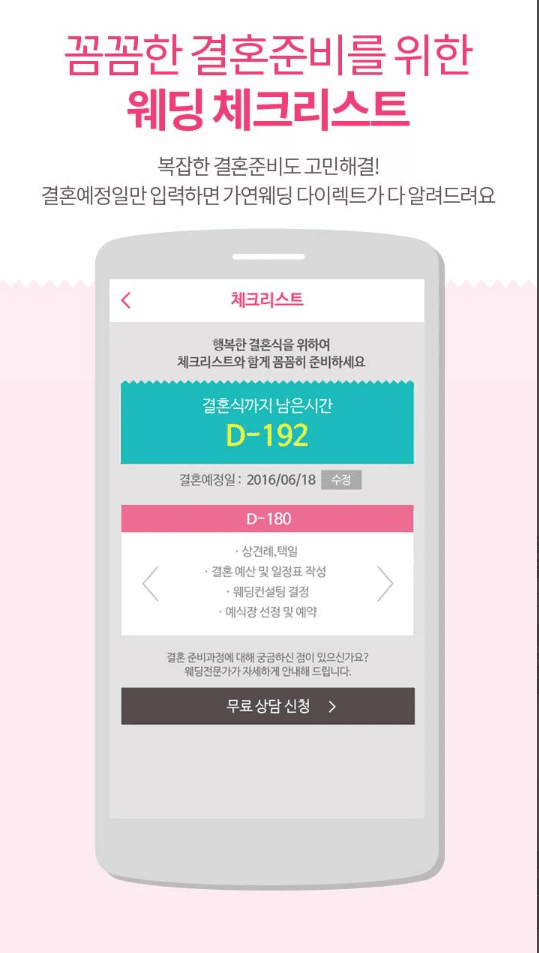 결혼예정일만 입력하면, D-Day별로 어떻게 준비해야 할 지 알려드립니다.