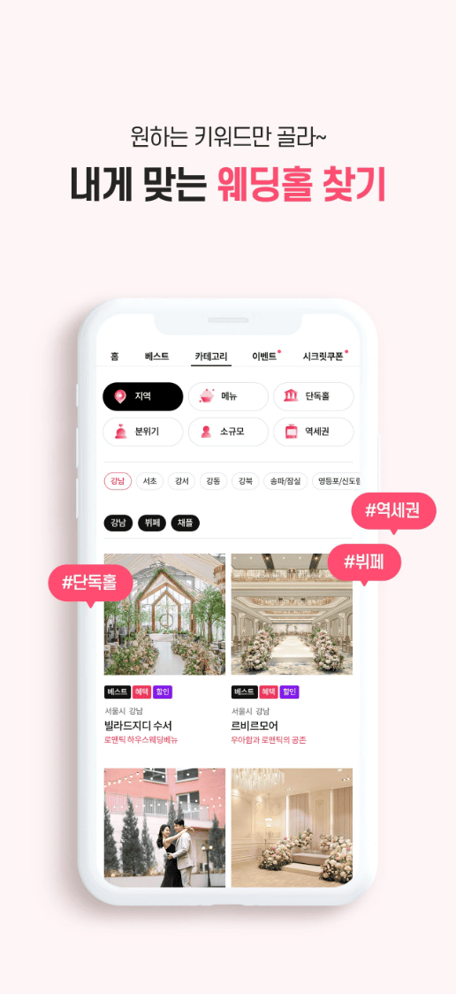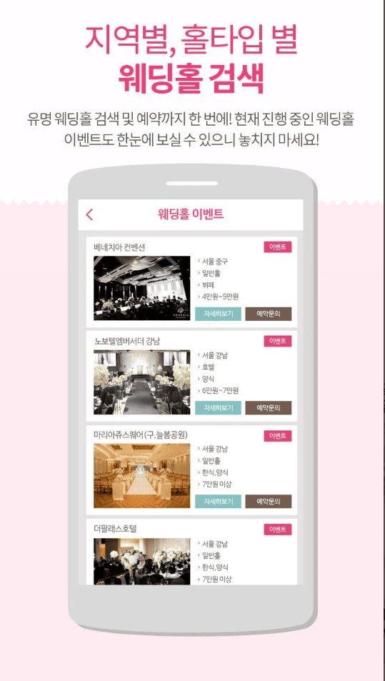 지역별, 홀타입 별 유명 웨딩홀 간편 검색 및 예약!