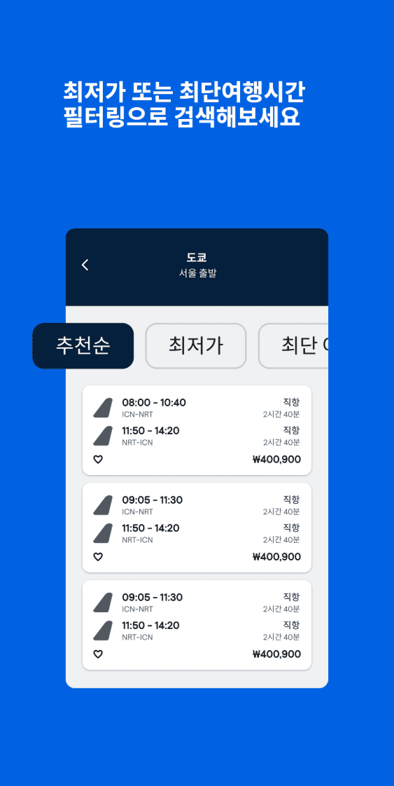 비행시간, 항공사, 출발 공항, 직항 여부(경유 횟수), 좌석 등급, 출·도착 시간을 스마트 필터로 설정하고 최적의 항공권을 골라보세요.