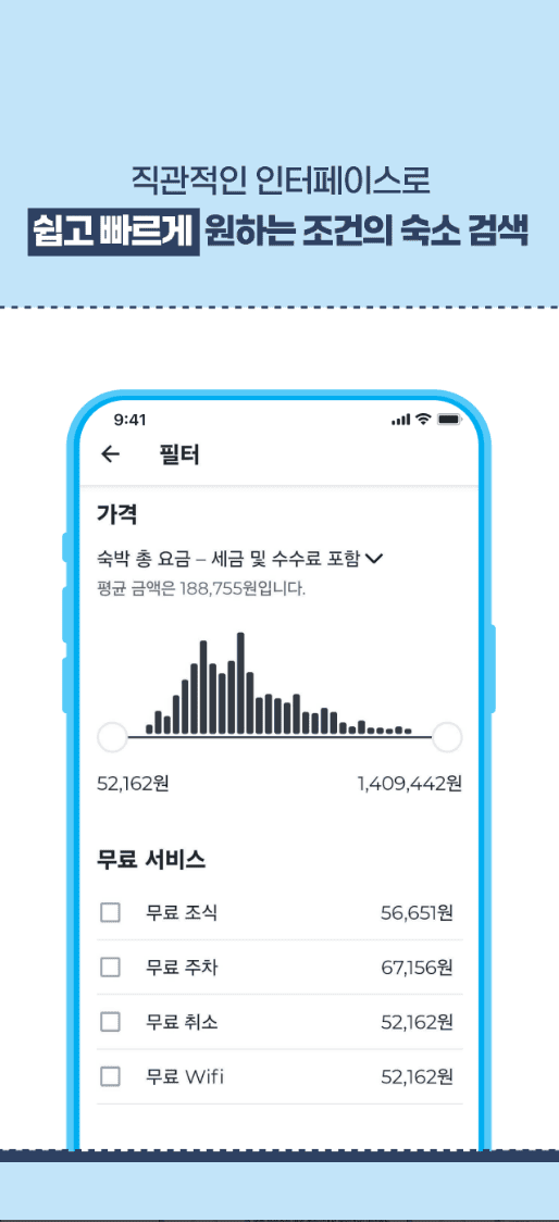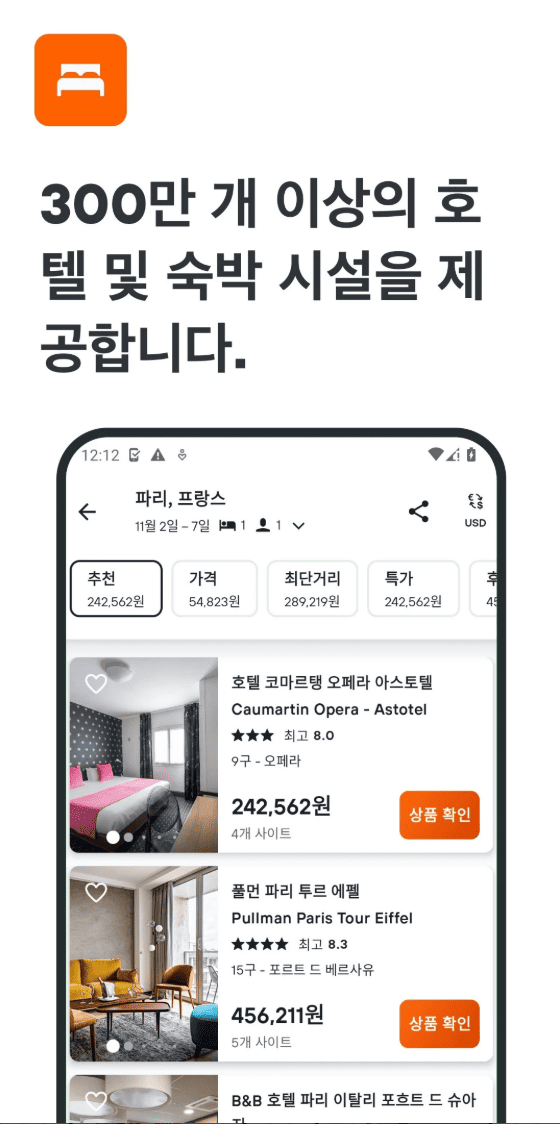 - 부티크 및 럭셔리 호텔, 공항 호텔, 저가 호텔, 호스텔, B&B, 휴가용 주택 및 리조트를 포함해 전 세계 100만여 개 호텔 중 원하는 상품 선택