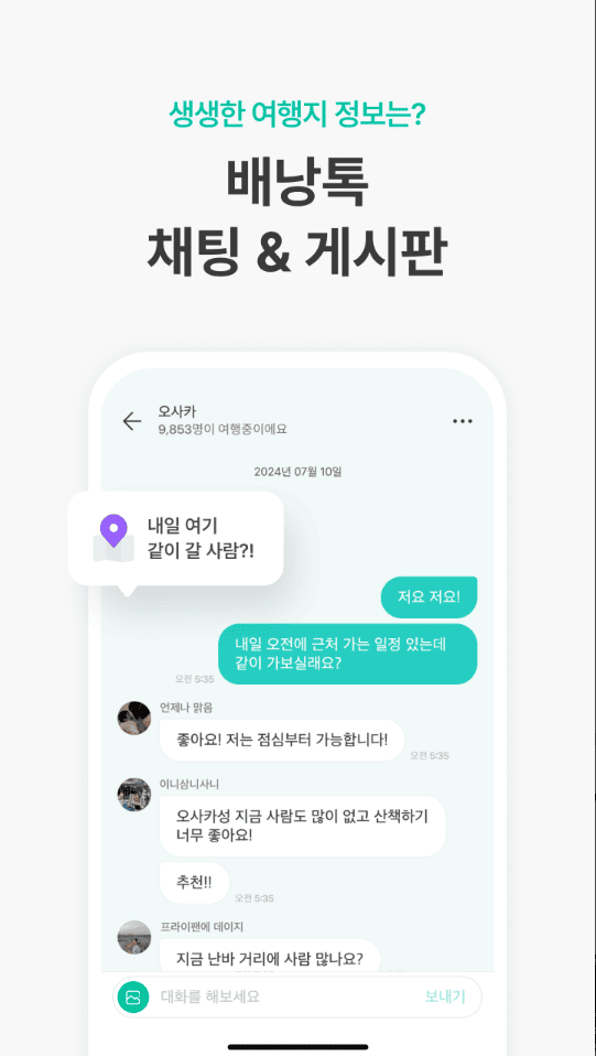 옷차림 고민? 맛집 줄 서기 현황? 다른 여행자들과 배낭톡에서 만나 생생한 현지 소식을 나누세요#
