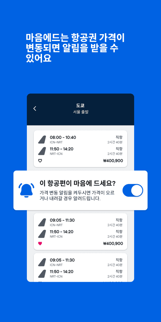 관심 항공권이나 숙소에 하트를 눌러 저장하면 언제든 목록에서 확인하고 예약을 마무리할 수 있습니다. Price Alert 푸시 알림으로 원하는 가격에 자동으로 알려 드립니다.