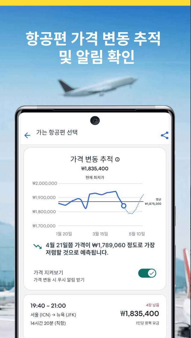 회원은 항공편을 추적하고 가격이 인상되거나 인하될 때 무료로 알림을 받으실 수 있어요.