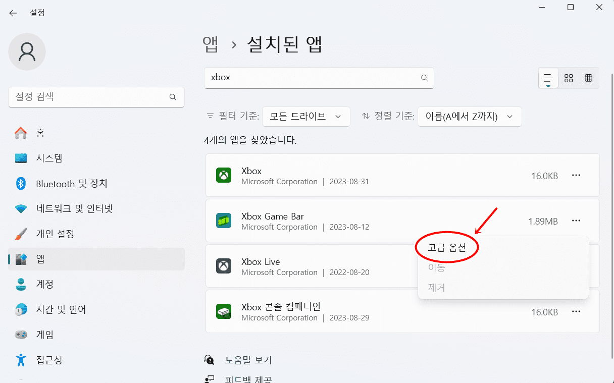개인 설정에서 xbox game bar 끄기