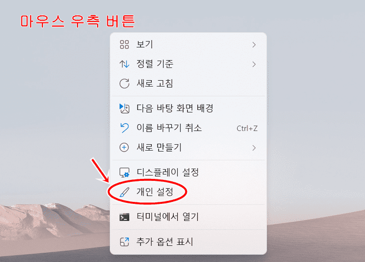 1. 바탕화면의 빈 공간을 [마우스 우측 버튼]으로 클릭합니다.