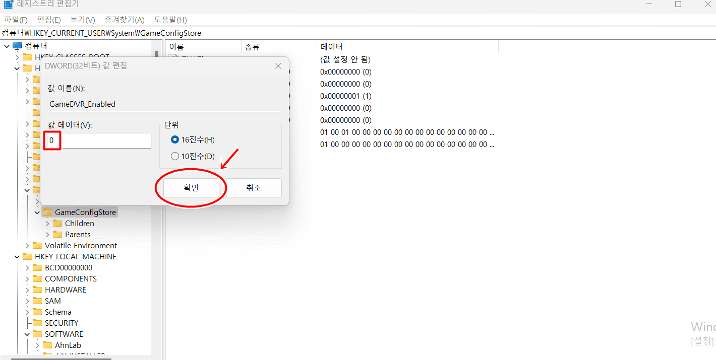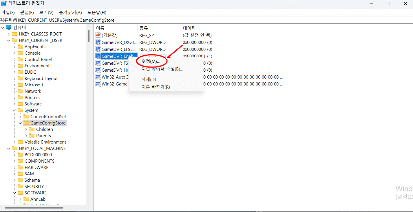 5. 그러면 ₩HKEY_CURRENT_USER₩System₩GameConfigStore 항목으로 이동합니다. 여기서 [GameDVR_Enabled]를 [마우스 우클릭]을 합니다.