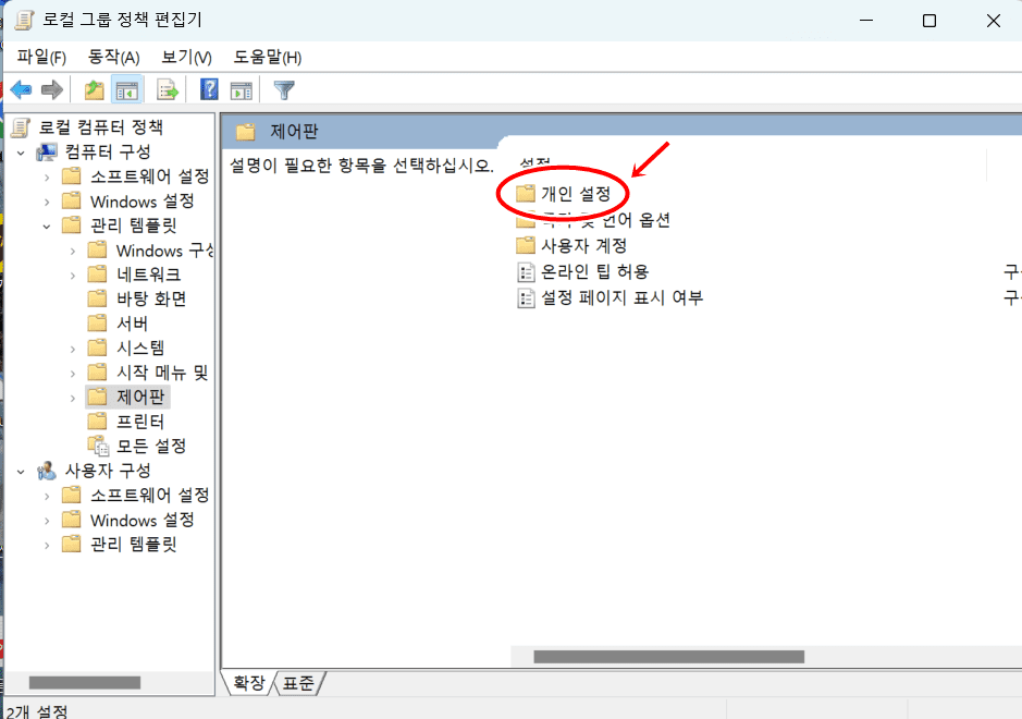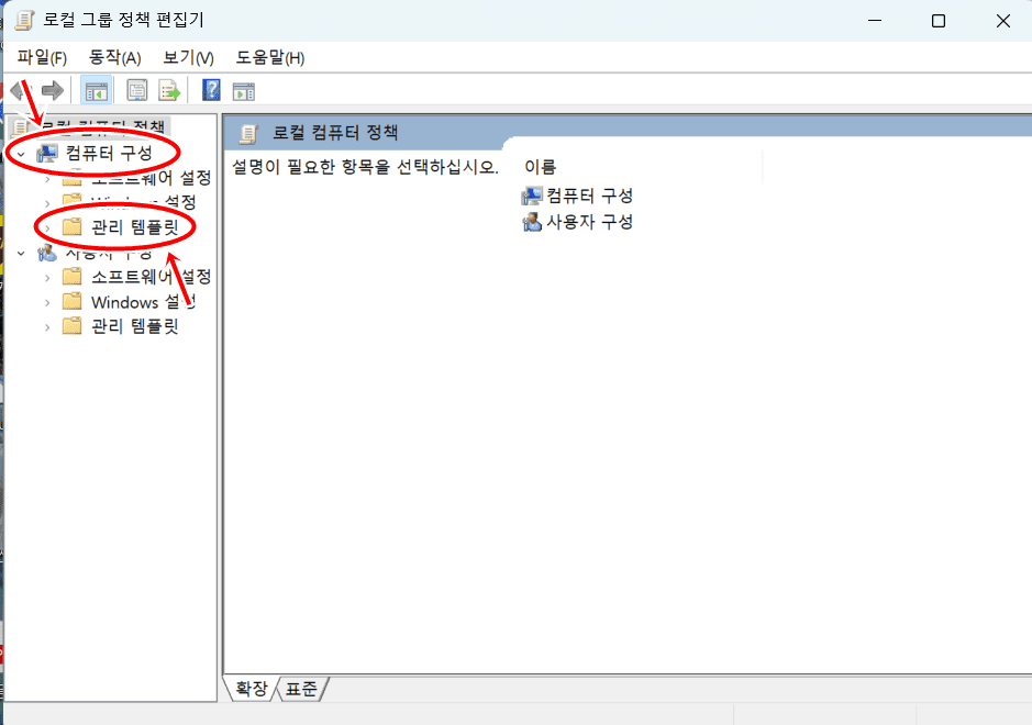 4. 로컬 그룹 정책 편집기 창이 뜨면 왼쪽 목록에서 [컴퓨터 구성 > 관리 템블릿]을 클릭합니다.