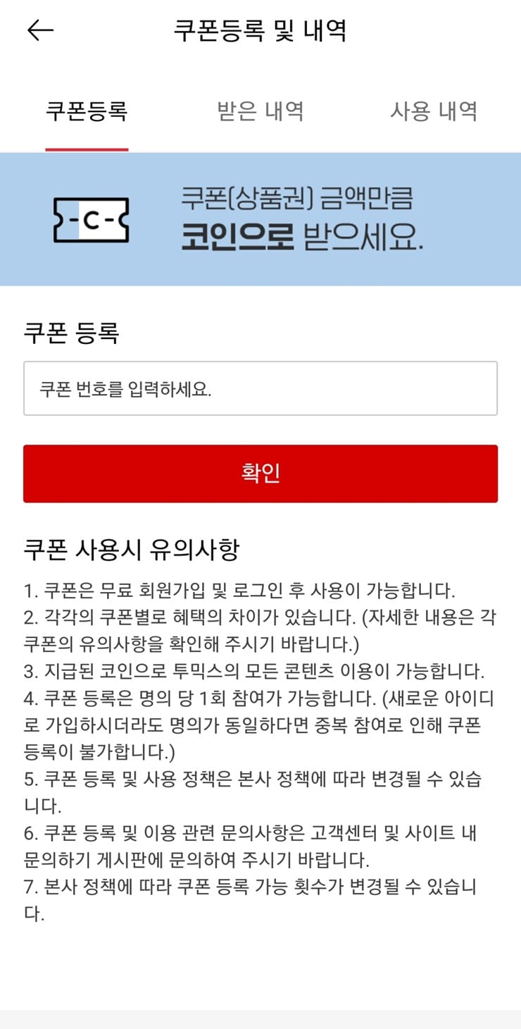 ☞ 쿠폰 사용 : [쿠폰 등록] 페이지 > 등록 > 코인 적립