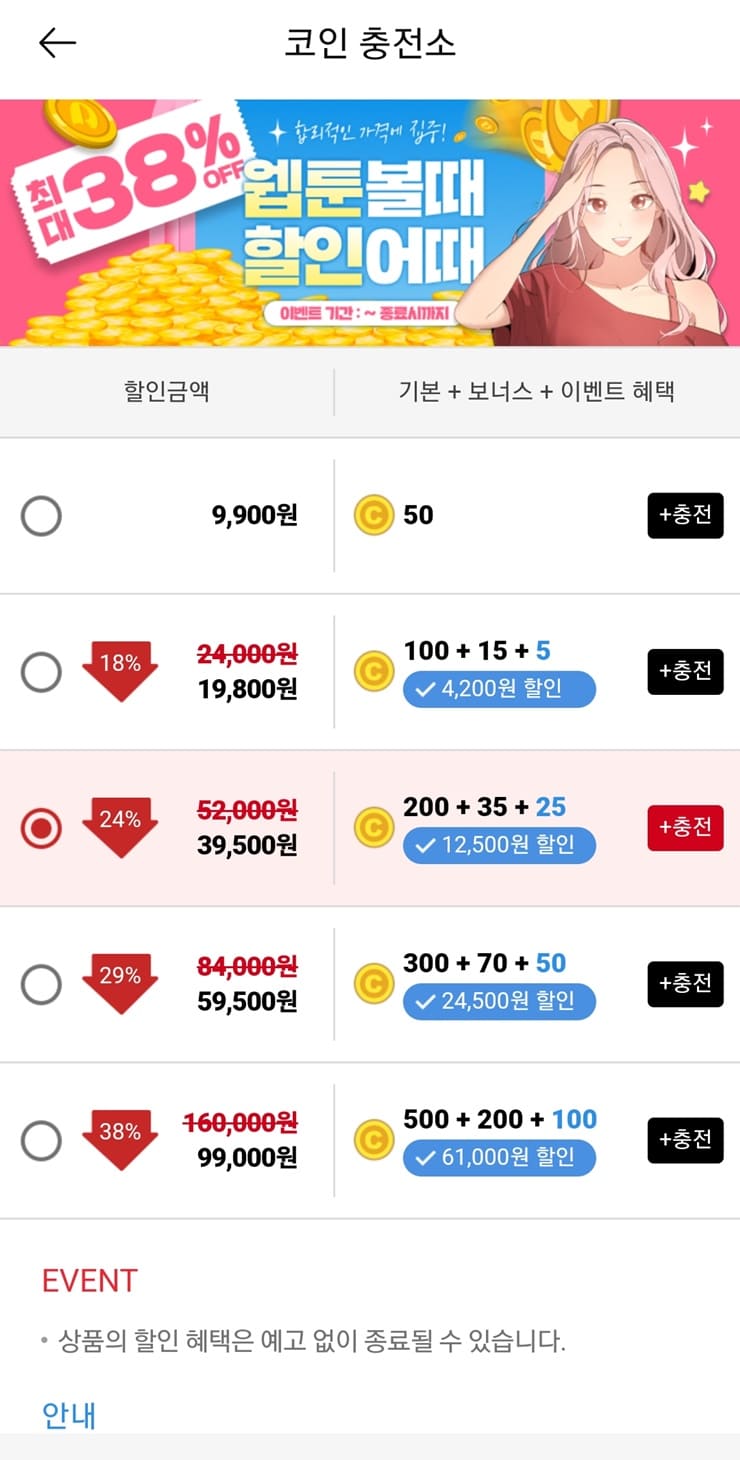 | 할인 금액 | 코인 충전 (기본 + 보너스 + 이벤트 혜택) |