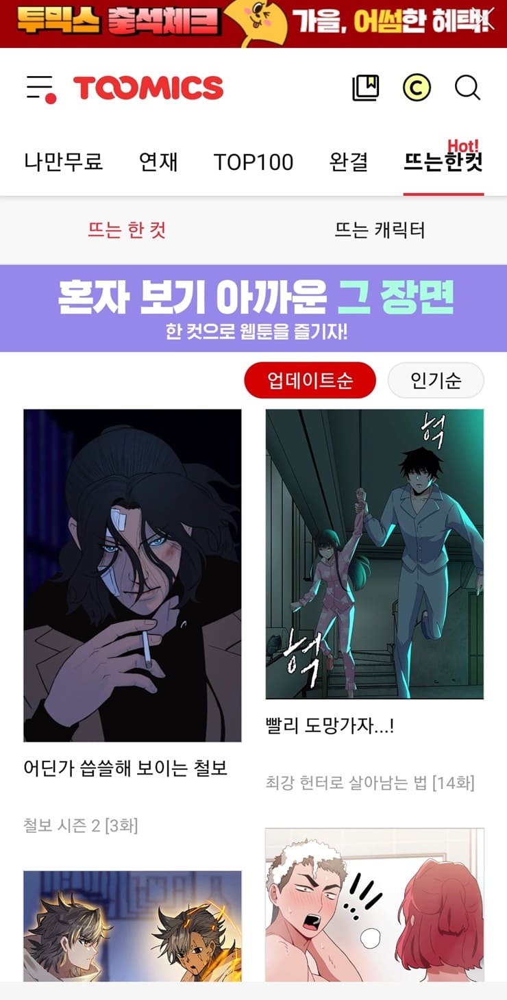 ▶ 요일 별 웹툰의 경우에는 해당 요일 전일 22시에 선업데이트에 됩니다. 그 외 카테고리의 경우에는 각 작가님의 사정에 따라서 달라질 수 있습니다.