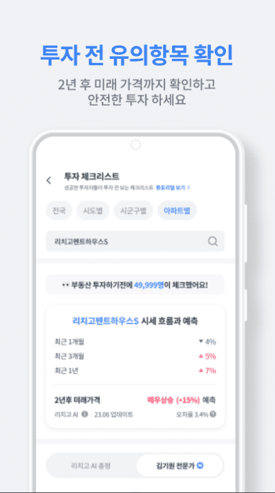 - 기존 여러 부동산 어플이 단순히 과거의 자료를 보여준다면 리치고는 AI를 통해 미래가치까지도 판단해준다는 점이 좋았습니다.^^
