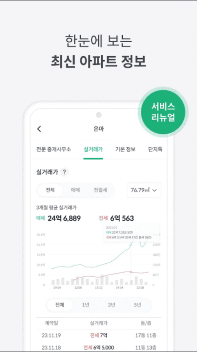 * 아파트 전문 시세 제공 : 면적별 시세, 연차별 시세를 통해 지역의 아파트 가격을 정확하게 파악할 수 있도록 돕습니다.